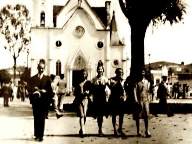 Família saindo da missa na antiga Igreja Matriz de Cataguases. |